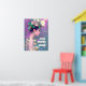 La decoración de las paredes. Arte inspirador. Alentamiento. Hermosa doncella asiática con flores en el pelo tocando el piano. Notas musicales y fondo morado floral. Arte femenino generativo