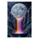 Una cerámica visionaria de arte de alto relieve que retrata un eterno paisaje ajeno. Una luna colosal con acristalamientos opalescentes, perlentos y sutiles acristalamientos domina un cielo índigo y violeta profundo flanqueado con detalles de estrellas cristalinas. Desde debajo de la luna fluye una cascada radiante de acristalamientos de arco iris fundido (rosados, amarillos, cianes y púrpura) que caen en cascada entre acantilados jaleados y cristalinos, acristalados en teales profundos, azules y amatistas. El flujo luminoso se recoge en una cuenca reflectante obsidiano-negra, reflejando tanto la luz celeste como los colores vivos. El artículo combina una geología fantástica y una elegancia futurista, mostrando un control de vidrios magistral y detalles escultóricos que evocan el misterio, la serenidad y el asombro.