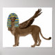 Una pintura digital del gran esfinge. El esfinge es de un cuerpo de leones, con alas y cabeza de mujer. Un tocado y maquillaje egipcio azul y amarillo está en la forma femenina del esfinge. Ella tiene un cuerpo de león largo y delgado con grandes alas marrones.