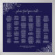 Este bonito cuadro de boda presenta un fondo azul marino de color gris claro con asientos para entre 200 y 240 personas. Presenta un diseño sencillo y elegante con un toque de color plateado de Relieve metalizado falso decorativo en las esquinas. El título está escrito en sofisticada caligrafía de guión y dice: Por favor, encuentre su mesa.