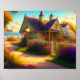 La encantadora impresión poster cuenta con una fantástica vista al océano con cabaña de playa, valla de piquetes, pasarela de arena y muchas flores y árboles. Pintura digital creada con software de IA.