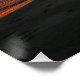 Fotografía tropical del atardecer tomada en espectaculares tonos coloridos de rosa, púrpura y naranja en el cielo. El agua del mar se refleja en el brillante color naranja de la sangre con un bote al fondo. La playa de arena tiene dos velas encendidas en naranja de fuego mientras el crepúsculo brilla en este paraíso tropical de atardecer.