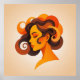 El diseño tiene un perfil femenino estilizado con el pelo espiral, en ricos tonos de naranja, marrón y oro. Su expresión exuda confianza en calma, los ojos cerrados en un momento de serenidad. La paleta de colores cálidos y las formas curvilínicas crean una armoniosa mezcla de encanto vintage y diseño gráfico contemporáneo. Perfecto para entusiastas de la moda, amantes del arte y todo aquel que se atreva con estética atrevida y femenina que celebra la belleza de la diversidad.