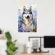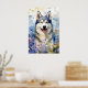 Coloridas acuarelas de un Husky sentado en un campo de flores de primavera.