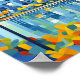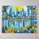 moderno cuadro cubista de un vibrante horizonte urbano con altos edificios que reflejan las aguas tranquilas. Las formas abstractas y los tonos fríos realzan el ambiente urbano.