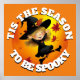 Esta es la temporada para ser espeluznante y una bruja linda en un gorra negro está bailando en hojas de otoño.