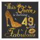 Esta reina cumple 49 años y la fabulosa camisa es perfecta para celebrar su cumpleaños 50. Esta camisa presenta un diseño purpurinoso y diamante de imitación en la parte delantera con un colorido cartel de 50 años al otro lado de la espalda. La tela es cómoda y resplandeciente, por lo que es perfecta para cualquier día de verano. Ya sea que esté haciendo recados o hospedando a un fiesta, esta camisa hará que se vea fabulosa.