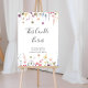 Esta señal de vela floral silvestre colorida clásica es perfecta para una boda rústica. El diseño presenta flores silvestres amarillas, púrpuras y blancas con follaje en un fondo de acuarela rosa y verde.