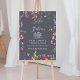 Este letrero de estación de selfie floral silvestre azul clásico es perfecto para una boda rústica o ducha de novia. El diseño presenta flores silvestres amarillas, púrpuras y blancas con follaje en un fondo de acuarela rosa y verde. Personalice el letrero con su hashtag de boda.
