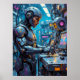 Esta pintura representa a una ciborg hembra operando una estación de trabajo compleja en un entorno futurista. Su cuerpo y casco son una mezcla de grises metálicos y blancos, acentuados con brillantes luces naranjas. El fondo es una espesa y compleja red de máquinas y monitores, todo representado con un estilo grueso y texturizado. La paleta de colores de la obra crea un ambiente dinámico y tecnológicamente avanzado.