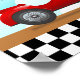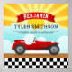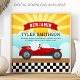 Póster de anuncio de nacimiento para el cuarto del bebé con tipografía moderna y un coche rojo lindo en un fondo colorido de amanecer. Agrega todos tus detalles encantadores en esta plantilla fácil de usar para hacer tus propias estadísticas de nacimiento únicas.