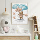 Un adorable oso bebé rosa marrón con globos y estrellas con nubes azules encima de ella. Agrega el nombre de tu hija y su cumpleaños. Un póster perfecto para el cuarto del bebé.
