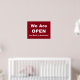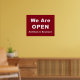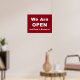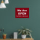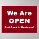 Un poster rojo simple pero audaz que es apto para fines comerciales que dice, "ESTAMOS ABIERTOS y de vuelta en el negocio" para ser mostrado para un negocio, organización o grupo que ha sido temporalmente cerrado. Una gran manera de hacer saber a todos que estás abierto y de vuelta en el negocio. Mostrarlo en la ventana de la tienda es una opción.