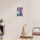 Un personaje colorido con pelo morado y ojos grandes y expresivos, con un atuendo futurista adornado con ornamentos circulares e iridiscentes. Tiene un suave y etéreo resplandor alrededor de ella y el fondo brilla con luces de neón, lo que sugiere un vibrante entorno urbano al atardecer o a la noche.