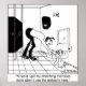 Un hombre en un baño con un lavabo y un espejo muy bajos que hasta ahora se ha inclinado sobre su nariz casi toca los dedos de sus pies dice: "Al menos hago mis ejercicios de estiramientos cuando uso el baño aquí".