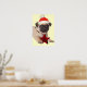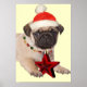 Navidades Impresión de cachorro Pug posando con un adorno en forma de Estrella de Navidades Rojos en su boca y lleva un sombrero de Santa roja y coloridas campanas navideñas alrededor de su cuello.