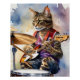 Color del agua salpicado arte de un gato gris de tabby tocando guitarra en un chaleco rojo violáceo y pantalones cortos de denim.