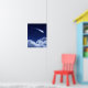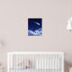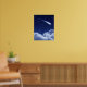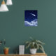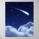 Un poster de una estrella fugaz y blanca vuela por el oscuro cielo nocturno sobre una almohada de nubes blancas onduladas debajo.