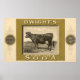Pintura publicitaria de marca de ilustracion de época con refrescos súper bicarbonados de la marca Dwight. El texto dice: primero, más barato, mejor, John Dwight & Company, Nueva York. Publicidad antigua con una vaca de pie en un campo agrícola.