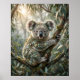 Un encantador koala de eucalipto descansa pacíficamente entre ramas brumosas en lo alto de un dosel forestal. Características realistas de koala se mezclan con hojas de eucalipto plateadas, texturas de corteza, pelaje suave y delicados acentos botánicos. La luz del amanecer filtrada y la niebla a la deriva crean una atmósfera fresca y tranquilizadora llena de calidez y serenidad. Este adorable diseño premium aporta comodidad y belleza natural a guarderías, dormitorios, espacios de bienestar o colecciones de regalos. Perfecto para amantes de los koalas, fanáticos de la vida silvestre australiana y temas de decoración de naturaleza relajante.