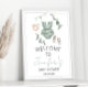 Reciba a sus huéspedes con encanto y estilo utilizando nuestro elegante cartel de bienvenida con la temática "vegetación botánica", donde se exhiben eucalipto de color verde agua, ropa de bebé y chica de juguetes.