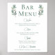 Un sencillo y elegante guión de caligrafía verde con dos hojas de eucaliptos acuarelas a ambos lados en la parte superior alrededor del título del menú de la barra. Un bonito y minimalista menú de bebidas otoñales poster con su detallada carta de vinos, cerveza, licores y bebidas sin alcohol. Moda, decoración moderna de boda por la noche para una ocasión en el jardín por la noche.