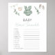 Sofisticado juego clásico de "Disputa de la palabra del bebé" diseñado para una ducha de bebé, adornado con un encantador vestido de niña, zapatos, juguete y hojas de eucalipto verde. Haga participar a sus huéspedes en este delicioso juego, perfecto para añadir diversión y emoción a su celebración mientras crea recuerdos preciados. Respuestas: 1. diaper 2. rattle 3. pacifier 4. fórmula 5. embarazo 7. stroller 8. asiento de automóvil 9. botella 10. vivero 11. bassinet 12. contracciones