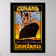 Cartel de viaje de vintage de los transatlánticos de la línea Cunard que muestra el RMS Berengaria en el mar en un ambiente gráfico de colores vivos y estilizados.