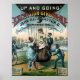 Circa 1885 - Publicidad para Ale jengibre con globo y canasta con asistentes negros. Dos mujeres beben Excelsior Ginger Ale, insinuando que el carbonato ayuda a que el globo se eleve. Imagen de dos mujeres vestidas a la moda con trajes largos y delgados y bonnets embarcándose en un paseo en globo aerostático, una se para dentro de la canasta sosteniendo un pañuelo de borde de encaje con un operador de globo con bigotes con binoculares y un monóculo, y la otra sopla jengibre de un vaso cuando empieza a subir una escalera de cuerda al avión; dos hombres afroamericanos con botellas de jengibre globo; una gran multitud observa el espectáculo desde las gradas detrás de una valla de madera blanca pintada con lemas publicitarios