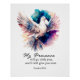 Poster cristiano con escritura de cita inspiradora representa una hermosa paloma blanca que vuela por el cielo, sus alas adornadas con salpicaduras de pintura azules y lavanda. Presenta un motivador Éxodo Verso de la Biblia 33:14, "Mi Presencia irá contigo, y te daré descanso".