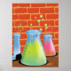 Experimentos de ciencia personalizado. Tubos de ensayo y frascos de vidrio frente a una pared de ladrillo sentada en un banco de madera.