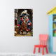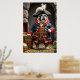 Esta imagen cautivadora presenta un Bulldog francés blanco y tostado, magníficamente vestido como capitán de un pirata, con un gorra de tricornio de plumas y un elaborado abrigo azul oscuro con guarnecido rojo y brillantes acentos dorados. El distinguido canino se erige con orgullo con una pata sobre un cofre del tesoro abierto de aspecto antiguo repleto de monedas de oro. Su lengua, que se asoma con humor, añade un toque de personalidad caprichosa a este retrato aventurero y regal.