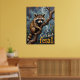 Esta fascinante obra de arte captura un mapache con sus características marcas, subiendo hábilmente un tronco de árbol enrollado. El fondo es una mezcla suave de tonos azules oscuros y amarillos apagados, lo que posiblemente indica el ocaso o el amanecer en el bosque. La frase "CUTE PERO FERAL" aparece destacadamente en letras blancas y estilizadas al final de la imagen, insinuando la naturaleza salvaje del animal.