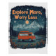 Escena clásica de una camioneta de camper estacionada junto a un lago de montaña, pinos y estrellas por encima. La frase "Explorar más, preocuparse menos" arcos a lo largo de la parte superior, con letras retro bien gastadas para una apariencia relajada y aventurera.