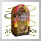 Fabulosa caja de juke de estilo Art Deco retro con títulos de música de los años 50 y 60 por todas partes y recuerdos al frente