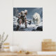 A fierce female warrior stands ready with her axe in a snowy landscape, face-to-face with an imposing polar bear. The scene conveys a sense of tension and bravery in the harsh, icy terrain.