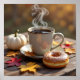 Stickers with a beautiful Autumn scene with a cup of warm coffee and glazed donut sitting next to a white pumpkin and Fall leaves.