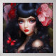 Retrato de una Princesa de Flor Cuta con vestido negro rodeada de flores y mariposas de colores. Arte original de Gifts_AtTheCorner ©2023.