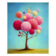 Ein fantasievoller Baum mit schlankem Stamm steht im Zentrum dieses Designs. Die Krone setzt sich aus zahlreichen runden Elementen in verschiedenen Größen zusammen, die in Farbtönen von Pink, Magenta und Gold gehalten sind. Eine feine Oberflächenstruktur verleiht den Kreisen eine weiche Optik. Das Motiv befindet sich vor einem ruhig verlaufenden blauen Hintergrund über einem warmen, ockerfarbenen Boden.
