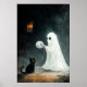 Póster Fantasma de Halloween y gato negro jugando con yar