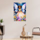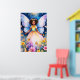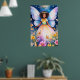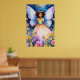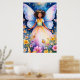 Poster de un joven chica con alas de mariposa se alza en un vibrante jardín, rodeado de flores de colores y estrellas brillantes. Su vestido es multicolor y lleva una corona de flores en su pelo rizado.
