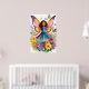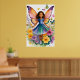 Poster de un joven chica con vibrantes alas de mariposa rodeado de flores coloridas, que exudan un sentido de magia y capricho. Su vestido refleja los tonos de sus alas, a juego con las mariposas brillantes que revolotean a su alrededor.