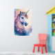Poster de un majestuoso unicornio con un cuerno brillante y colorido se representa en medio de un paisaje de suaves colores pastel. Su flor está adornada con delicadas flores, lo que crea una escena etérea y encantadora.