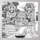 A heartwarming black-and-white illustration of a Newfoundland puppies enjoying beautiful spring day on the farm. The pups are sitting in a vintage farm truck with bundles of tulips. Beautifully detailed line art adds depth and texture, making this design perfect as a relaxing coloring page or a charming gift for dog lovers. The simple yet expressive scene invites you to bring it to life with your own creative colors.All art hand drawn by Notta Bear Newfoundlands (ww.nottabear.net)