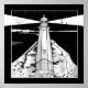 Ilustracion blanco y negro del faro situado en el extremo de la orilla de rocas en Nelson, Nueva Zelanda. Este faro está en el corte cerca y tiene la isla de la costa de ultramar al fondo.