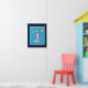 Un poster de temática náutica. Fondo azul oscuro con un marco azul claro sobre la parte superior. En el interior del marco hay un faro de rayas rojas y una bola de playa, y un sol sonriente y una gaviota voladora a lo lejos.