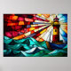 El diseño presenta una impresionante escena de faro de vidrio pintado de imitación.