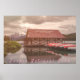La imagen muestra la Malige Lake Boat House, una estructura de madera con techo rojo, situada en un lago en el Parque Nacional de Jasper, Canadá. Hay varias canoas rojas y blancas adosadas al barco. El lago refleja el edificio y el cielo nublado de arriba.
