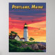 Un faro blanco clásico se encuentra en lo alto de una costa rocosa, bañado por el cálido resplandor de una vibrante puesta de sol sobre el océano.