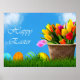 Colores de Pascua, cielo soleado, tulipanes florecientes, "Feliz Pascua".
